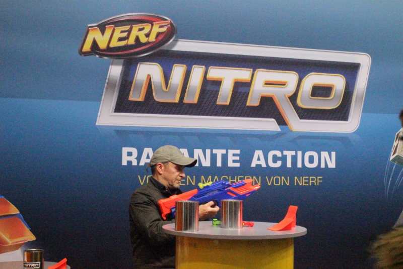 img_1324 Schauspieler Erdoğan Atalay stelle Nerf Nitro von Hasbro vor. Bei Nerf Nitro kann die eigene, ultimative Stunt‐Strecke aufgebaut und für jedes Rennen immer wieder neu ausgetüftelt werden. Und da die Soft-Racer über eine weiche Karosserie verfügen, geht selbst bei dem spektakulärsten Rennen nichts zu Bruch.Ab August werden sieben Produckte erscheinen, Darunter befinden sich das Nerf Nitro Flash Fury Chaos Set, Nerf Nitro DuelFury Demolition Set,Nerf Nitro DuelFury Demolition Set,  ThrottleShot Blitz das Einstiegs-­Blaster Set, Longshot Smash Spezial-­Set für Weitsprung Champions, Soft Racern 3er oder 6er Pack.