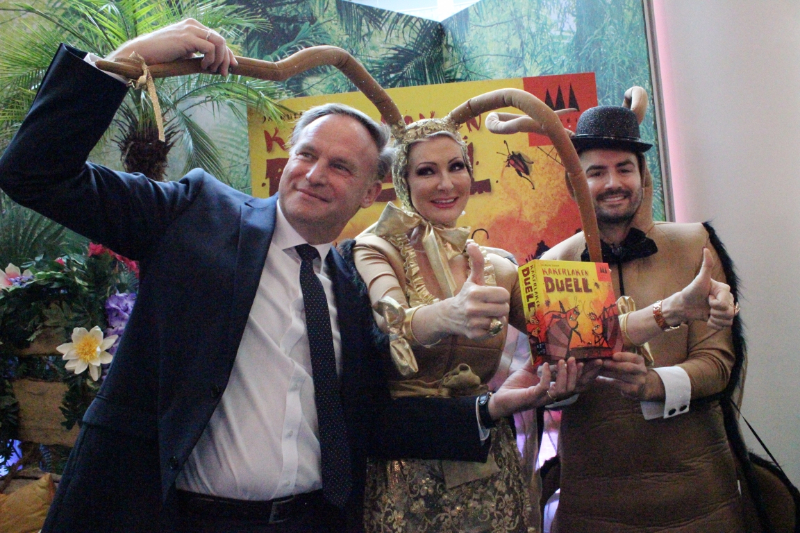 „Königin“ Désirée Nick und „König“ Menderes Bağcı stellten für Schmidt Spiele Kakalaken Duel vor. Gerade weil es beim "Kakerlaken Duell" mitunter recht turbulent zugehen kann, dürfen die beiden Trickser und Täuscher den Überblick nicht verlieren, wollen sie dieses geniale Bluffspiel für sich entscheiden. Das "Kakerlaken Duell" von Drei Magier, kostet ca. 16 Euro und ist für Spieler ab acht Jahren geeignet.