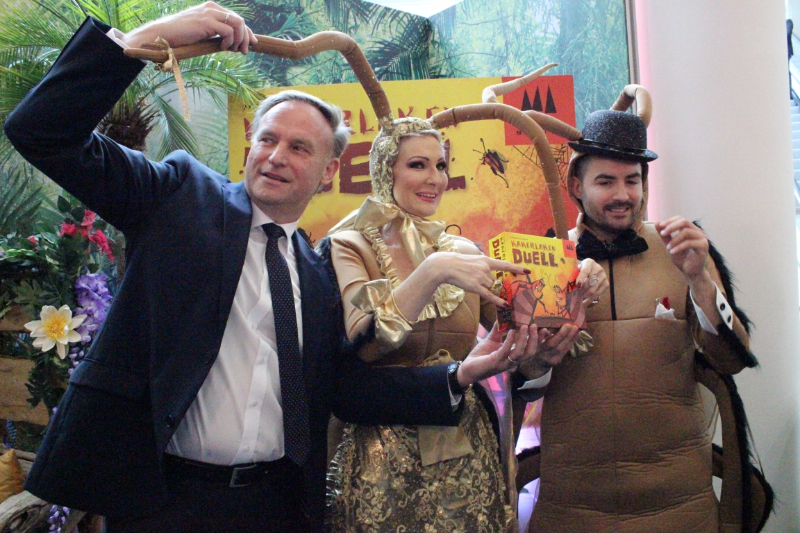 „Königin“ Désirée Nick und „König“ Menderes Bağcı stellten für Schmidt Spiele Kakalaken Duel vor. Gerade weil es beim "Kakerlaken Duell" mitunter recht turbulent zugehen kann, dürfen die beiden Trickser und Täuscher den Überblick nicht verlieren, wollen sie dieses geniale Bluffspiel für sich entscheiden. Das "Kakerlaken Duell" von Drei Magier, kostet ca. 16 Euro und ist für Spieler ab acht Jahren geeignet.