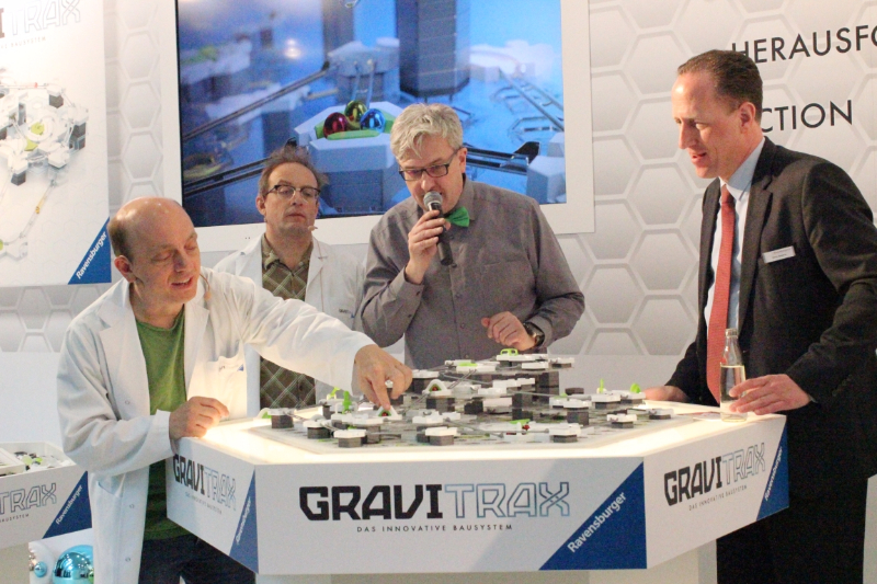 Die Entertainer Bernhard Hoëcker und Wigald Boning stellten für Ravensburger Gravitrax vor. GraviTrax – Das Spiel mit der Schwerkraft : Die Physik folgt ihren eigenen Regeln. Im September bringt Ravensburger ein anspruchsvolles Kugelbahn-System auf den Markt, das mit den Gesetzen der Schwerkraft spielt. Kinder wie Erwachsene sind dabei immer wieder aufs Neue herausgefordert, aktionsreiche Streckenverläufe zu planen, auszuprobieren und zu realisieren. Durch Magnetismus, Kinetik und Gravitation bahnen sie so den Kugeln einen Weg ins Ziel.