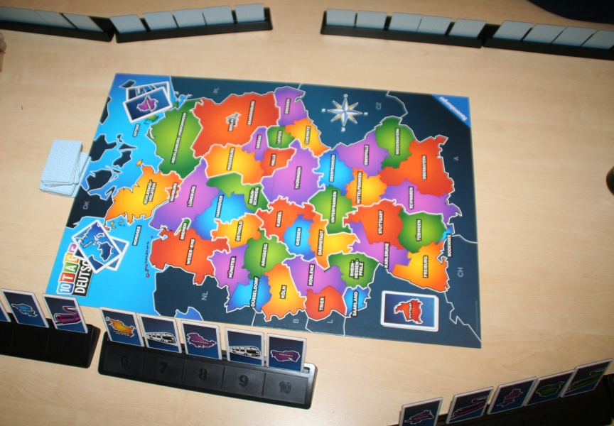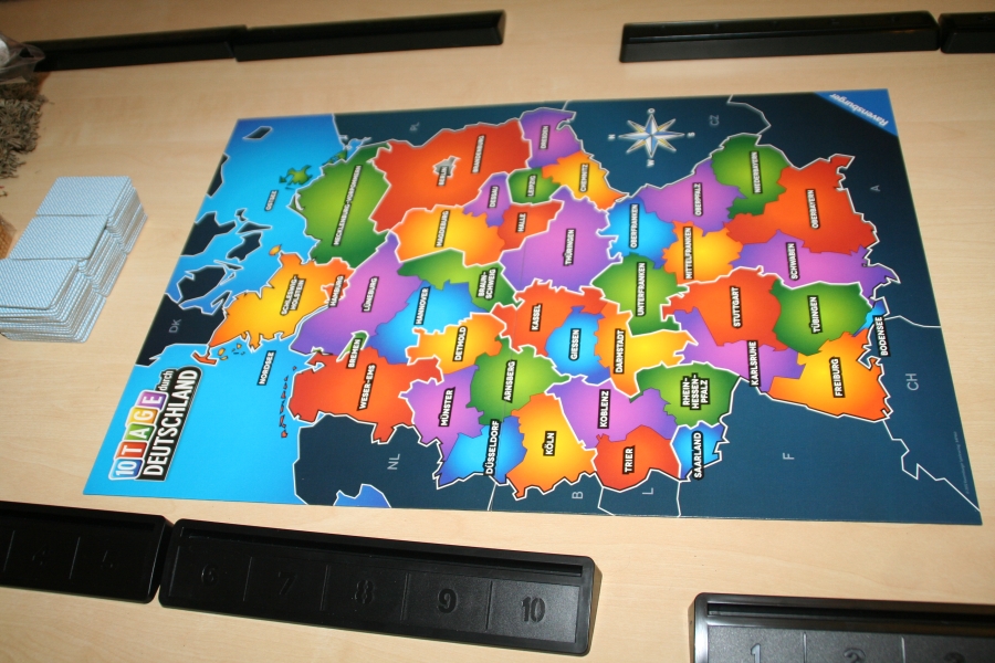 10 Tage durch Deutschland ist ein einfaches und interessantes Kartenlegespiel. Man kann sehr schnell die Regeln erlernen was den Einstieg sehr erleichtert. Auf dem ersten Blick sieht das Spiel aus als würde es ein Geographiespiel / Lernspiel sein. Dies ist aber weit gefehlt. Es geht nur darum eine Route durch verschiedene Landstriche Deutschlands zu planen. Das Spiel ist von den Mechanismen sehr Glücklastig, aber dennoch sehr lustig. In unseren Testrunden kam das Spiel sehr gut an, nachdem man erklärt hatte, das es nichts mit einen Geographielernspiel zu tun hat.