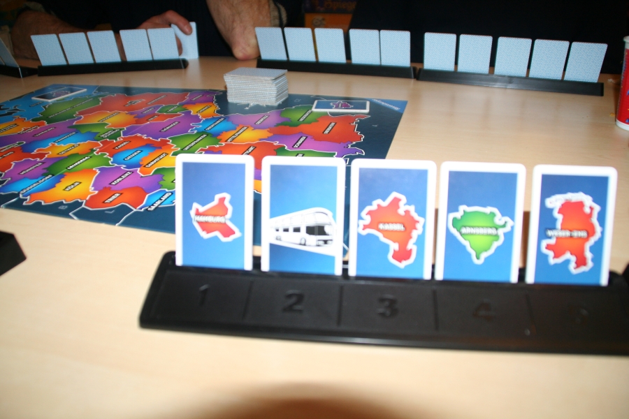 Jeder Spieler arbeitet nun seinen Kartenstapel von oben nach unten ab, indem er eine Karte zieht und in den Kartenhalter steckt. Hierbei wird versucht passende Städte nebeneinander zu bekommen oder mit Busen und Zügen zu verbinden.Für diese Phase ist folgendes zu beachten: Sobald eine Karte auf den Kartenhalter gestellt wurde, darf sie in dieser Aufbauphase nicht gegen eine andere ausgetauscht werden oder mit einer anderen den Platz tauschen!