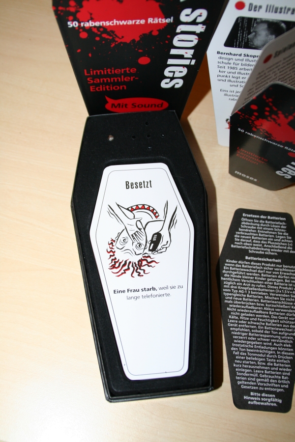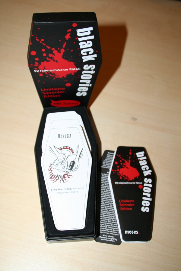 Wie bei allen Black Stories geht es auch hier wieder um die Themen Tod und Verderben. In diesem Spiel gibt es keinen Gewinner, sondern es geht nur darum eine Geschichte aufzuklären. Daher eignet sich dieses Spiel hervorragend als Partyspiel. Die Sammleredition enthält die selben Black Stories, die bereits in der erste Edition verwendet wurden. Die Verpackung und die Karten sind in Sargform. Beim Öffnen der Verpackung beginnt diese Schaurig zu lachen. Für Fans der Black Stories ist diese Version eine Kaufempfehlung.