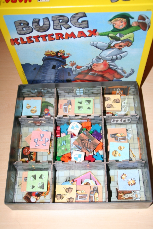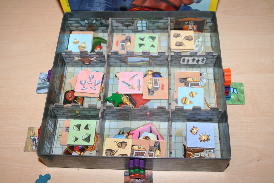 Die Burg muss vor dem ersten Spiel in der Schachtel aufgebaut werden, hierzu werden die 4 Burgwände in einander gesteckt, so dass neun Kammern entstehen.