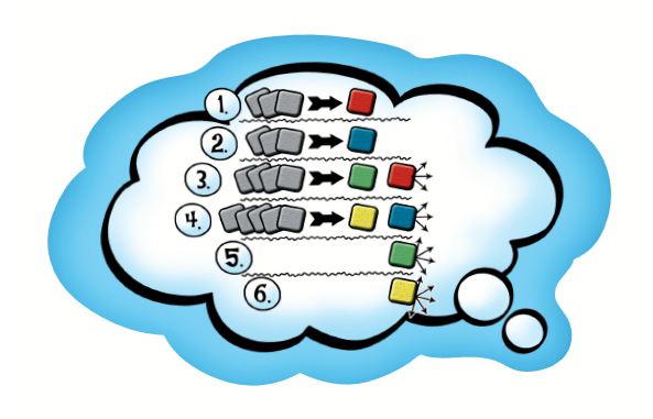 Die Bildplättchen werden nach dem der Spieler die Geschichte erzählt, auf der Ablagetafel auf der jeweiligen Farbe die, die Denkblase in der Runde zeigt abgelegt.