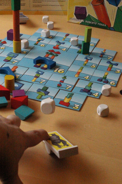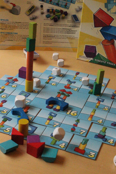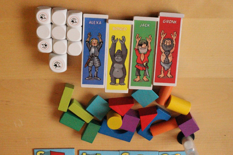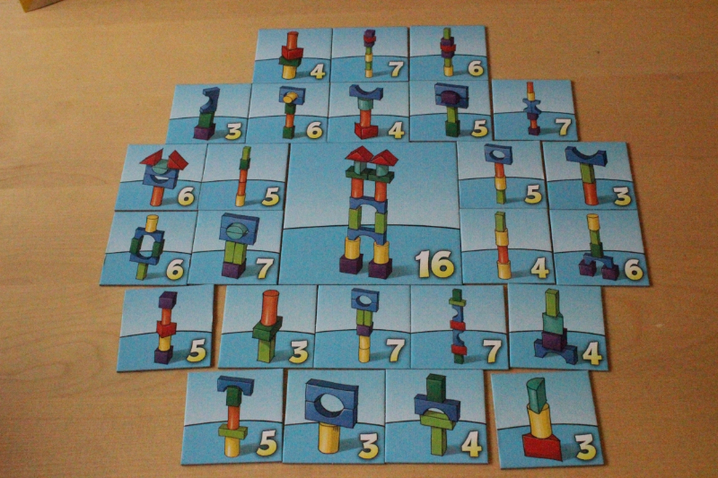 Die große Turmkarte wird in die Tischmitte gelegt und die kleinen drumherum wie auf dem Foto. Dies stellt nun das Spielfeld dar. Wer zuletzt auf einem Turm war, darf als erster bauen und nimmt sich dafür alle Bausteine zu sich. Die anderen Spieler sind die Saboteure und bekommen jeder ein Katapult.