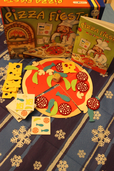 Die Zutaten werden in der Mitte verteilt, die Pizzakarten gemischt und verdeckt auf einen Stapel gelegt. Jeder Spieler erhält ein Pizzaboden und eine Pizzakarte.
