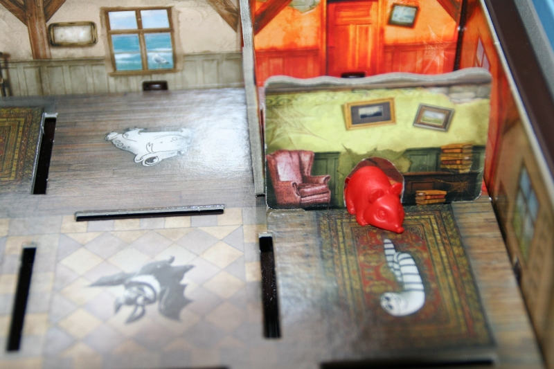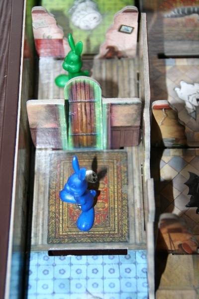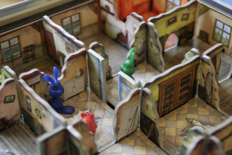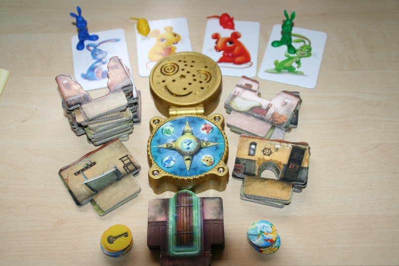 Die Spielvorbereitungen bestehen dadrin die verschiedenen Durchgänge sortiert neben den Spielplan zu legen, der Karton dient als Spielplan. Nach den Vorbereitungen kann man sich für eine der 3 Schwierigkeitsstufen entscheiden. Es stehen die Schwierigkeitsstufen einfach, mittel und schwer zur Verfügung. Je nach Schwierigkeit erhalten die Spieler mehr oder weniger Hilfe im Spiel. Nach der Wahl der Spielstufe übernimmt das Spielmodul die Regelerklärung und ist für Erzählung der Geschichte zuständig. Jetzt kann jeder Spieler eins der 4 Tiere wählen in dem er seine Spieltafel vor sich legt. Es gibt den grünen Hasen, den blauen Hasen, die gelbe Maus und die rote Maus. Es muss immer eine Maus und ein Hase dabei sein, da es verschiedene Durchgänge gibt durch die jeweils nur eins der beiden Tiere gehen kann.
