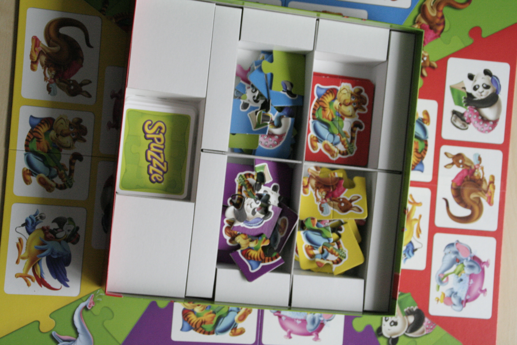 Jeder Spieler sucht sich eine der 4 Farben aus und nimmt sich alle Puzzleteile dieser Farbe und legt sie sortiert nach Tieren vor sich ab. Die Karten werden gemischt und verdeckt in die Mitte des Spielplans gelegt.