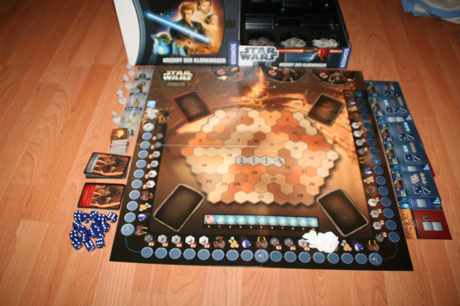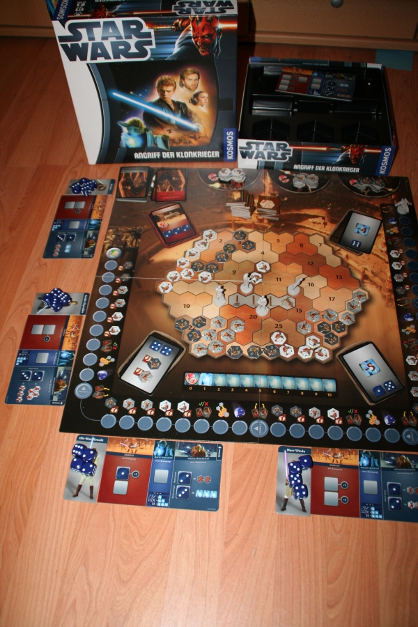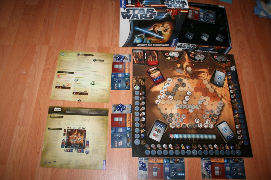 spielaufbau2 Das Spielbrett wird in die Tischmitte gelegt und die Druiden-Plättchen werden sortiert und neben die entsprechenden Abbildungen gelegt. Die Mega-Bedrohungskarten werden sortiert und bereitgelegt. Die oberste Mega-Bedrohungskarte wird auf das passende Feld des Spielplans gelegt. Die restlichen Bedrohungskarten werden gemischt und es werden drei auf den Spielplan aufgedeckt gelegt. Der Macht-Marker wird auf Feld 1 gelegt und das Kanonenboot wird auf Runde 1 gestellt. Jeder Spieler sucht sich eine Jedi Figur und das passende Plättchen sowie ein Fähigkeiten-Tableau dazu aus und legt es vor sich ab. Jeder Spieler darf seinen Jedi auf ein Feld neben die vier Säulen auf dem Spielplan stellen, diese dürfen nicht betreten werden. Je nach Spieleranzahl werden die Würfel wie folgt aufgeteilt: Bei zwei Spielern bekommt jeder 8 Würfel. Bei drei Spielern bekommen zwei je 5 Würfel und einer 6. Bei vier Spielern bekommt jeder 4 Würfel. Es gibt auch für jede Spieleranzahl die passenden Fähigkeiten-Tableaus.