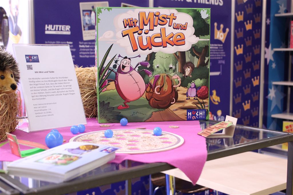 Mit Mist und Tücke ist ein Kinderspiel für 2-4 Spieler ab 5 Jahren, Familie Mistkäfer versucht ihre Kinder zufüttern dafür müsse drei Waldhöhlen bis zum Rand mit Mist gefüllt werden.
