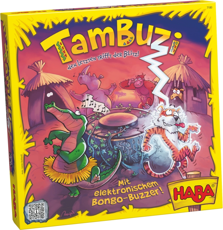 Tambuzi den Letzten Trifft der Blitz, ist ab 6 Jahre für 2-4 Spieler. Es ist ein blitzschnelles Reaktionsspiel mit elektronischem Bongo-Buzzer.