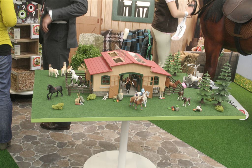 _MG_4793 Das Kinderzimmer wird zum Pferdehof von Schleich. Die erste Themenwelt von Schleich dreht sich um die klassische Produktlinie Farm Life. Ab April erscheinen  24 neue Pferdezubehörartikel wie z.B. Halfter, Stroh & Heuballen und ein Reitparcours. Ab September wird es dann einen naturgetreu gestalteten Pferdehof geben.